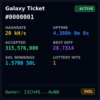 Upon minting, your Galaxy Ticket NFT is automatically assigned to your wallet address with unique sequential numbering. All data fields run live calculations directly on-chain.